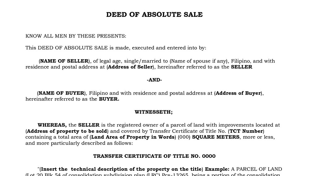 This is the document that pertains to the written agreement between you and the seller about your home purchase. It also details the sales provisions needed to be complied by both buyer and seller before full payment of the home. The Contract to Sell is only issued to homebuyers who have put up a down payment for their homes and pay the rest of the balance via home financing. It forms the basis for the execution of the Deed of Absolute Sale when all the conditions are met with properly. It is drafted by either the broker or the developer.