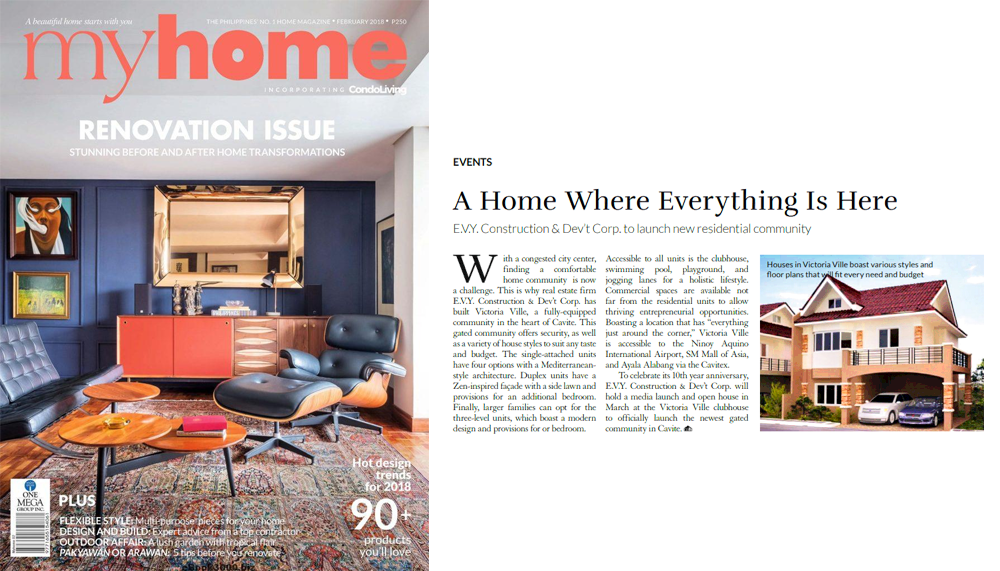 February 2018 - MyHome, the Philippine’s leading home magazine, in its Events section, gives a glimpse of Evy Construction & Development Corporation’s new pride that’s about to be launched – Victoria Ville community in the heart of Cavite.