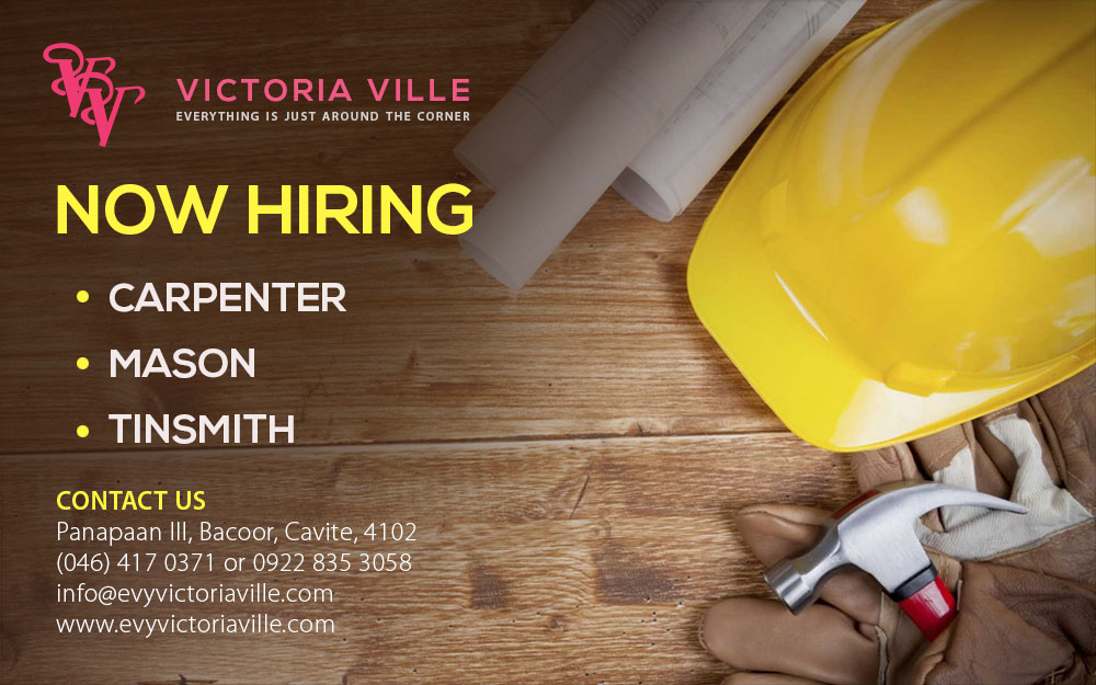 Job opportunities at EVY Victoriaville: We are now looking for skilled Carpenter, Mason and Tinsmith. For details regarding these positions and how to apply, contact us at (046) 417 0371 or 0922 835 3058. You may also drop by in our office at Panapaan III, Bacoor, Cavite, 4102 or send us email at info@evyvictoriaville.com